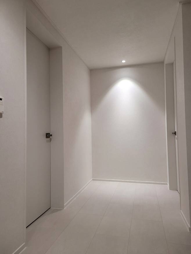 요즘 많이 하는 무몰딩은 아니지만 충분히 깔끔하고 후회 없습니다. 사진속인 안방 옆 벽에 나중에 액자를 걸어 분위기를 내고 싶은데 아직 마땅한 걸 찾지 못했네요. 또 한참을 찾아 해매일 것 같네요.^^