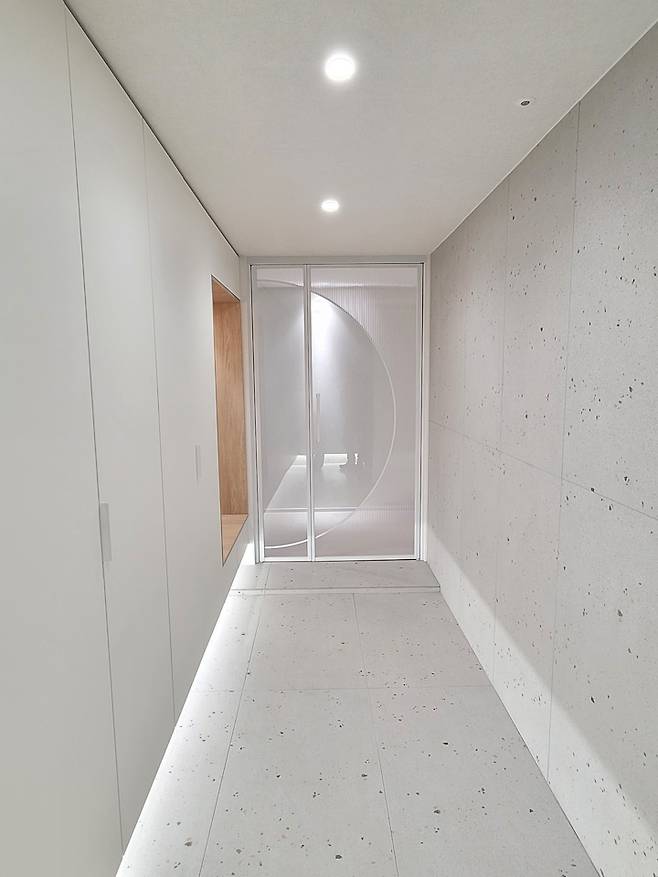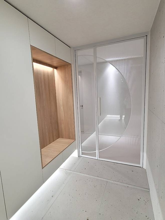 그리고 중문 옆에는 아이들이 신발을 신고, 벗을 수 있고 너무 화이트화이트한 현관에 포인트가 되어 주는 벤치장도 넣었습니다. 중문은 비대칭 양개형 스윙 도어로 반원 디자인에 모루 유리까지 들어가 너무 예쁜 것 같아요. 디자인도 평범하지 않고 저희 집 현관에 잘 어울리는 것 같아 너무 맘에 들어요^^