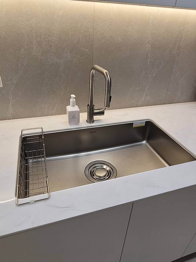 싱크볼은 백조 깜뽀르떼 860, 수성 바스 수전으로 골랐습니다. 깜뽀르떼는 백조 사각싱크볼중 가장 윗단계로 엠보 무늬가 물때가 잘끼지 않고 코팅도 되어있어 유지관리가 쉬운 것 같아 바로 선택하게 되었습니다. 수성바스 제품은 고가 브랜드와 비슷한 디자인이지만 가성비로 선택할 수 있는 브랜드로 이 ㄷ자 모양의 수전은 거위목 수전보다 물 튀김도 적고 디자인도 너무 이쁜 것 같아요. 아주 만족하고 있습니다.