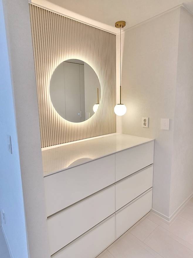 기존 화장대자리에는 입식 화장대로 수납장을 짜넣었어요. 상판은 좀 저렴한 걸로 하려다 주방과 같은 오로라 블랑으로 했는데 조명에 비친 대리석이 너무 이쁜 것 같아 화장대 앞에 설 때마다 기분이 좋아요. 화장대 벽면은 연베이지인 영림 필름 ps035색상의 템바 보드를 붙여 심플하지만 포인트를 주었어요. 거울 LED조명과도 잘 어울리는 것 같아요.