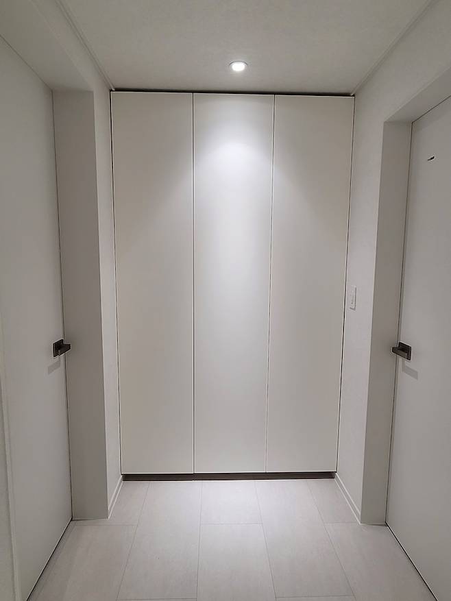 중문 열고 오른쪽에 있는 벽에 붙박이를 넣어 수납공간을 추가하였습니다. 역시나 서라운드 몰딩 없이 푸쉬장으로 깔끔하게 제작해주셨습니다.