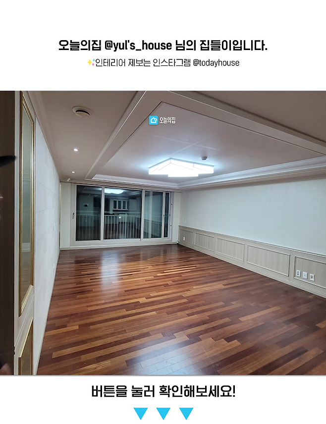 46평에 확장되어 거실 사이즈가 큽니다. 마루는 원목 마루라 좋은 거긴 하지만 싹 탈바꿈을 위해 다 교체 하였습니다. 깔끔하게 하자고는 했지만 너무 밋밋하지는 않아야 할 것 같아 레퍼런스를 참 많이 찾아봤습니다.