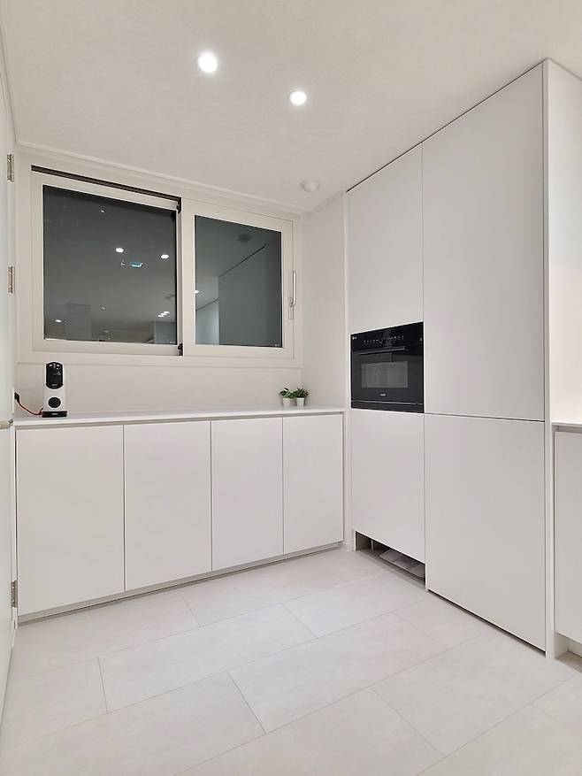 좌측 싱크볼이 있는 싱크대 공간 또한 많은 수납장 확보와 적절한 위치의 가전으로 배치 하였습니다. 싱크대 높이는 90cm로 하고 상판은 1.2cm로 총 91.2cm, 걸레받이는 8cm로 최대한 줄였습니다. 그래서 더욱 심플한 라인을 갖게 되었고 주방 벽면 타일은 그레이의 화이트 간지가 있는 1200*600각 타일로 하여 매지 라인은 최소로 하여 깔끔하고 고급스럽게 마무리 하였습니다.