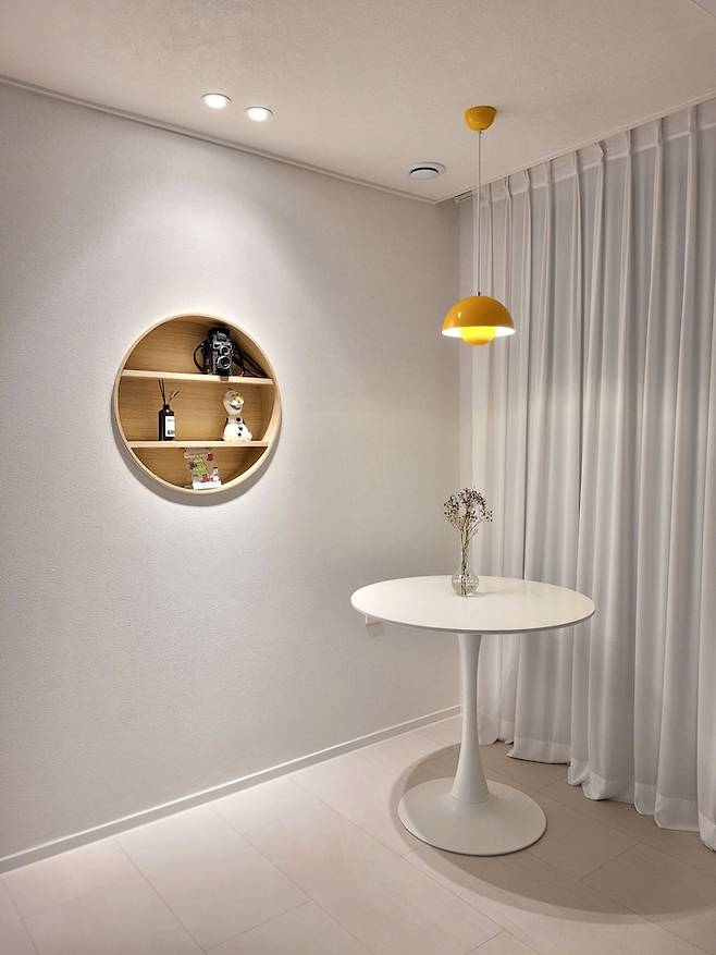 저는 넓은 거실의 포인트 공간을 만들고 싶어 원형 선반을 제작 요청을 드렸고 목공 작업과 우드 필름 작업으로 따뜻한 공간이 생겼습니다. 그리고 오른쪽 플라워 팟 포인트 조명 밑에 원형 티 테이블을 두었는데 이곳에서 남편과 둘이 티타임을 하며 이야기 할 수 있는 공간을 만들고 싶었습니다. 아직 테이블에 어울리는 의자를 찾지 못했는데 얼른 골라 저 공간을 활용하고 싶네요.
