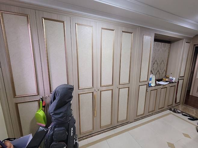 엄청 긴 현관입니다. 굵은 몰딩과 올드한 신발장 문까지 이 큰 공간을 어떻게 할까 고민하였습니다.