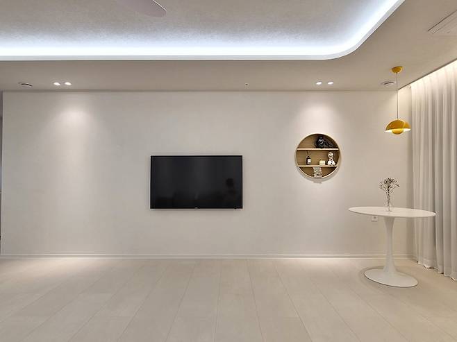 인테리어 감각이 없는 저는 추가 제작한 저 원형 선반 자체로 거실이 분위기 있어져 너무 맘에 드는 포인트 입니다. 티비 반매립을 위해 10센치의 가벽을 치게 되는데 가운데 티비 공간을 제외하고 버려지는 공간이더라구요.