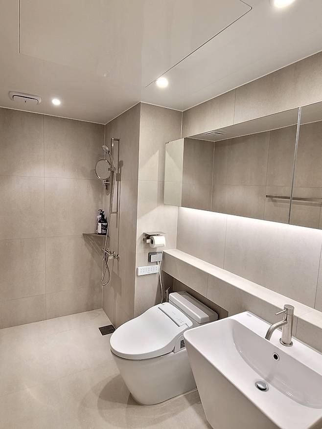 거울은 상시 LED 조명으로 선택했습니다. 욕실 거울 조명은 터치식으로 했을 때 불편하다는 글을 보고 상시로 했는데 역시 잘한 선택이었습니다. 조명은 모두 전구색으로 선택해서 따듯한 느낌이 드는데 주백색으로 하면 어떤 느낌일지도 궁금하긴 하네요. 참고로 화장실 조명은 주광색은 꼭 피하세요~