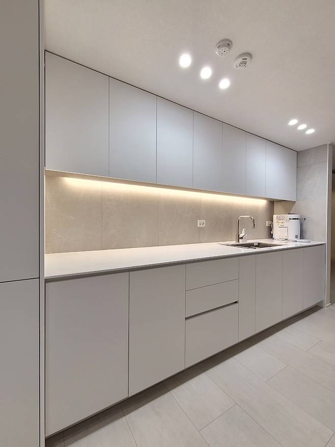 좌측 싱크볼이 있는 싱크대 공간 또한 많은 수납장 확보와 적절한 위치의 가전으로 배치 하였습니다. 싱크대 높이는 90cm로 하고 상판은 1.2cm로 총 91.2cm, 걸레받이는 8cm로 최대한 줄였습니다. 그래서 더욱 심플한 라인을 갖게 되었고 주방 벽면 타일은 그레이의 화이트 간지가 있는 1200*600각 타일로 하여 매지 라인은 최소로 하여 깔끔하고 고급스럽게 마무리 하였습니다.