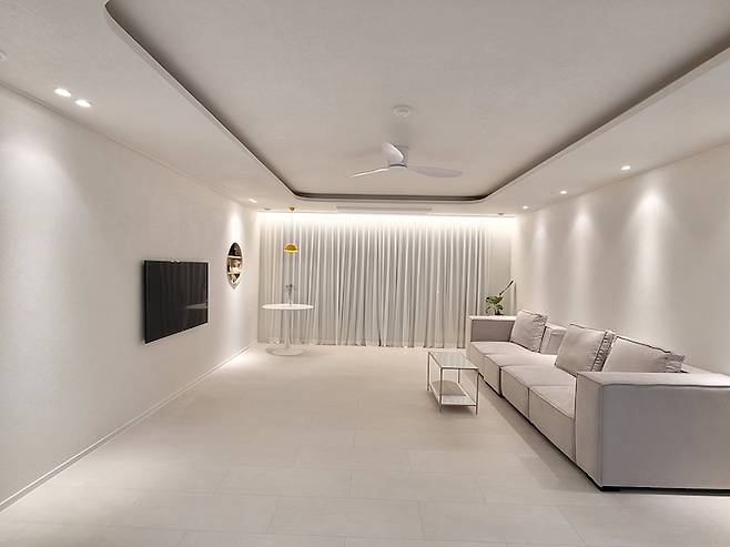 기존 천장의 우물을 살려 라운드 우물천장으로 변경 후 T5 LED로 간접등을 주백색으로 넣어 메인 조명을 하였고, 커튼 박스에는 전구색 T5 간접등, 티비, 소파 자리에는 3인치 COB 다운라이트 전구색 간접조명을 추가 하여 두가지 색감으로 가져갔습니다.우물 안에 실링팬은 알리에서 저렴히 구입해 설치하였는데 겨울엔 위에 더운 공기를 순환시켜주고 여름엔 에어컨 바람을 잘 퍼트려준다고 하네요. 아직 사용해 보지 못했지만 여름에 아주 잘 사용할 것 같습니다. 아쉬운 점은 방별로 있는 메인등을 사용하기 위해 방마다 설치 못한 게 아쉽네요 ㅎ