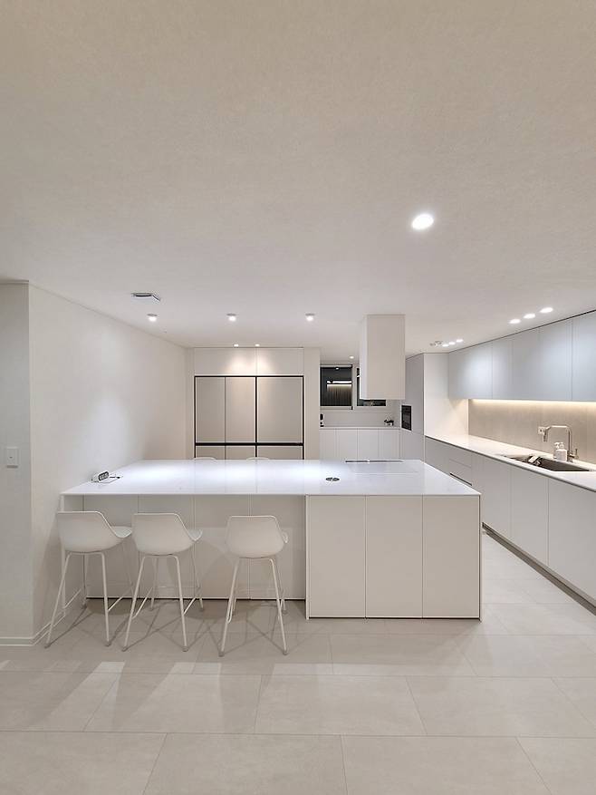 조명 설계시 다운라이트 매입조명은 최소로 넣었습니다. 너무 많은 매입등이 있는 천장은 자칫 상가 매장 조명처럼 보일 수 있을 것 같아 그렇게 진행했지만 조도가 부족하면 어쩌나 걱정했는데 다행히 딱 적당한 조도를 완성하였습니다. 그리고 주방 천장에 있는 우물을 막았는데 라인이 정리되고 훨씬 깔끔한 것 같습니다. 인테리어시 우물천장은 없앨지 살릴지 고민이 필요한 부분이니 참고하고 결정하시길 바래요.