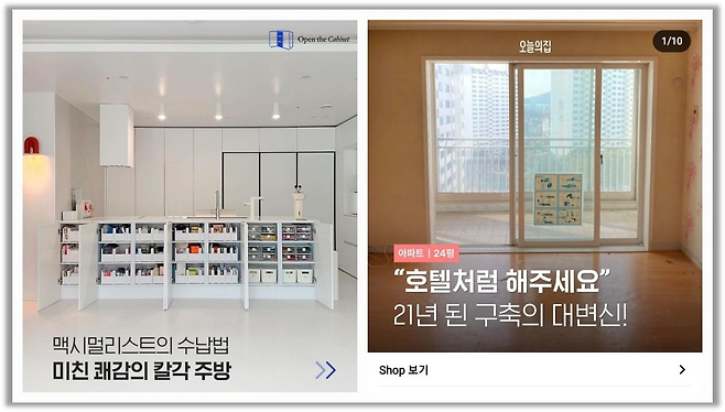 그리고 온라인 집들이 콘텐츠를 보다 보면 특징 하나를 발견할 수 있어. 바로 제품 구매 페이지가 직접적으로 노출되어 있지 않다는 점이야😯 인테리어 사진들을 보다가 괜찮은 가구나 소품을 발견하면 사진을 터치해서 제품 구매 페이지로 넘어가도록 구성되어 있거든.