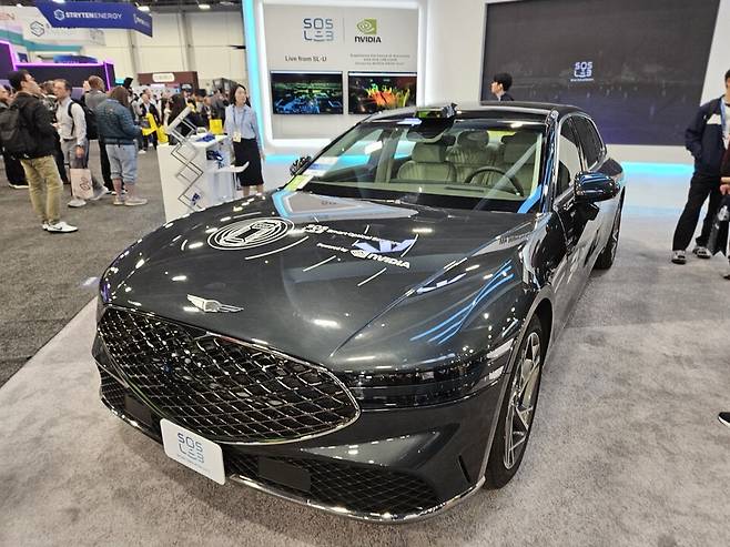 부스 중앙에 전시된 제네시스 차량은 관람객들의 발길을 멈추게 했다. 자율주행차라면 흔히 지붕 위에 큼지막하게 돌아가는 센서를 떠올리기 마련이지만 이 차량의 외관은 매끈했다. 에스오에스랩의 라이다가 헤드램프와 윈드실드(앞유리) 내부에 완전히 내장됐기 때문이다.
