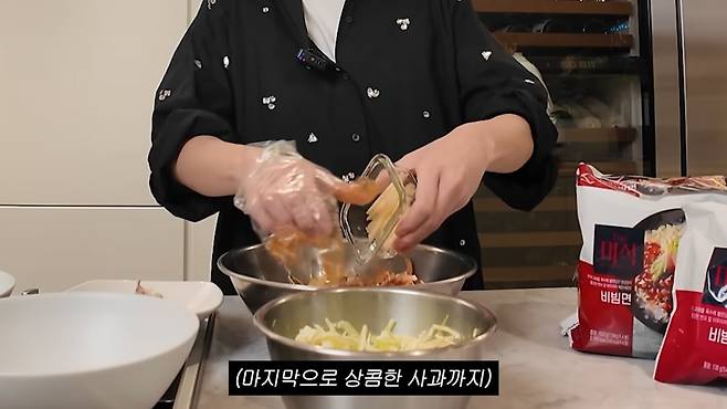 이민정이 택한 방식은 간단해 보이지만 목적이 분명하다. 채 썬 양배추, 찢은 닭가슴살, 채 썬 사과를 비빔라면에 곁들인다. 짠맛과 기름기를 줄이고, 포만감과 식감을 살린 조합이다.