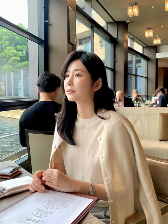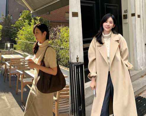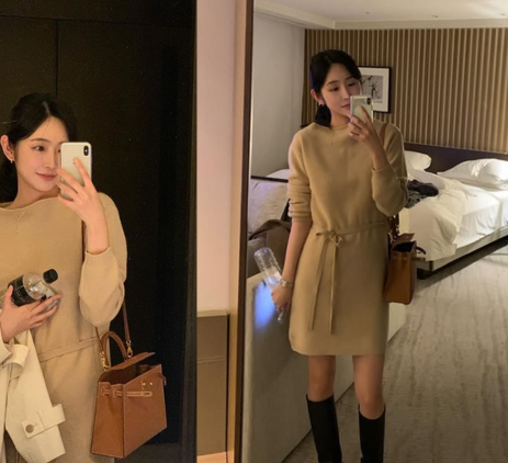 베이지 계열의 니트 원피스에 카멜 컬러의 에르메스 켈리백을 매치하여 여성스럽고 단아한 무드를 완성했다.