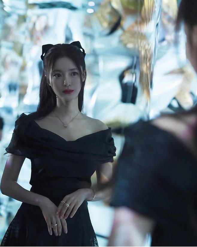 화이트 카라 디테일이 더해진 레드와 블랙 믹스 컬러의 원피스를 선택해 도시적인 이미지와 소녀 같은 감성을 동시에 담아냈습니다.