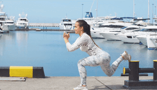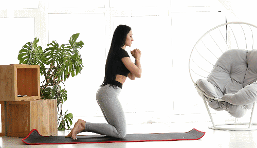 매트에 무릎을 대고 상체를 세운 상태에서 시작합니다. 오른발을 매트에 디딘 뒤 왼발도 붙여 스쿼트 자세로 전환합니다. 다시 무릎을 하나씩 매트에 대어 원래 자세로 돌아가며, 이 과정을 반복합니다.