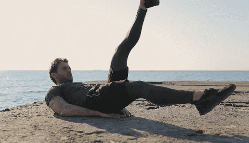 매트에 누워 손을 골반 아래에 두고 상체를 살짝 일으킵니다. 다리를 공중에 띄운 상태에서 왼발을 내리며 오른발을 올립니다. 양다리를 번갈아 교차시키며 반복합니다.
