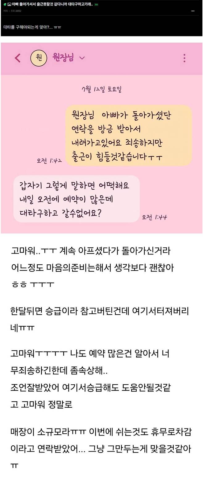 아버지가 돌아가셔서 출근 못 할 것 같다는 직원에게 원장이 한 말