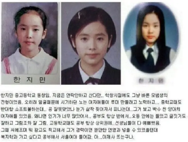 한 네티즌은 한지민의 초, 중, 고 졸업 앨범 사진을 게재해 그의 동창생임을 증명했다.