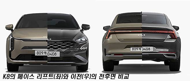 그렇다 보니 앞모습과 뒷모습이 통일성이 있는게 맞느냐 다른 게 맞느냐 하는 문제는 한 가지 답이 존재하지 않는, 선택의 문제라고 할 수 있습니다. 하지만 K8의 페이스 리프트 모델은 이런 이슈와는 다른 것일지도 모른다는 생각이 들기도 합니다.