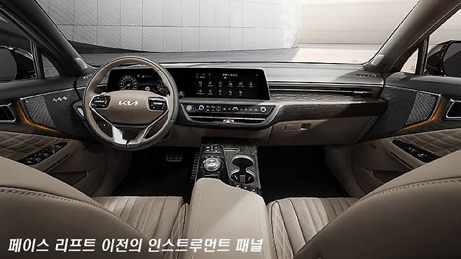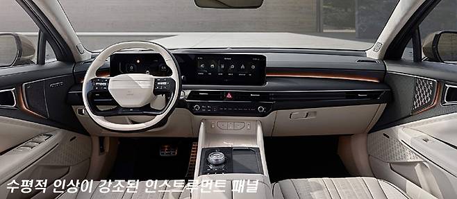 한편 실내의 모습 역시 수평적 인상을 더욱 강조했습니다. 약간 사다리꼴 형태로 위쪽이 좁아지던 이전의 디스플레이 패널 형태에서 페이스 리프트 모델은 좌우로 긴 완전한 사각형의 디스플레이 패널의 형태에 수평형 스포크의 스티어링 휠이 조합돼서 어딘가 자율주행 차량의 실내 같기도 한 이미지입니다. 페이스 리프트 이전의 인스트루먼트 패널과 스티어링 휠이 V 형태가 있는 3 스포크 형태이던 것에서 이제는 4 스포크 형태로 바꾸어 좀 더 수평적 단순성을 강조하고 있는 모습을 보여줍니다.