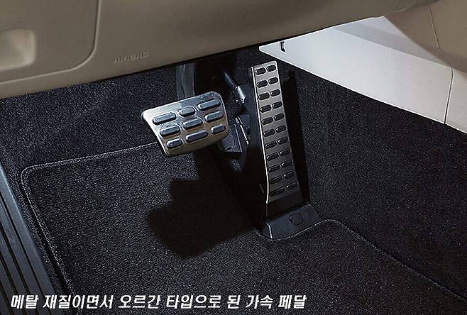 그밖에 눈에 띄는 디테일은 메탈 질감의 페달이고, 가속 페달은 오르간 타입 입니다. 수 년 전에 미국에서 일어난 승용차의 고속 질주에 의한 사고가 어이없게도 공중에 뜬 구조의 가속 페달 아래쪽에 실내 바닥에 깔려있던 매트가 구겨진 부분에 끼이면서 페달이 눌린 채로 고정돼 버리면서 급 가속 돼서 비롯된 것이었기에, 그에 대한 예방책이 바로 이처럼 페달의 아래쪽이 바닥에 고정된 오르간 타입의 가속 페달인 것입니다. 사고란 종종 이처럼 참으로 어이없는 원인에 의해서도 일어나는 것 같습니다.