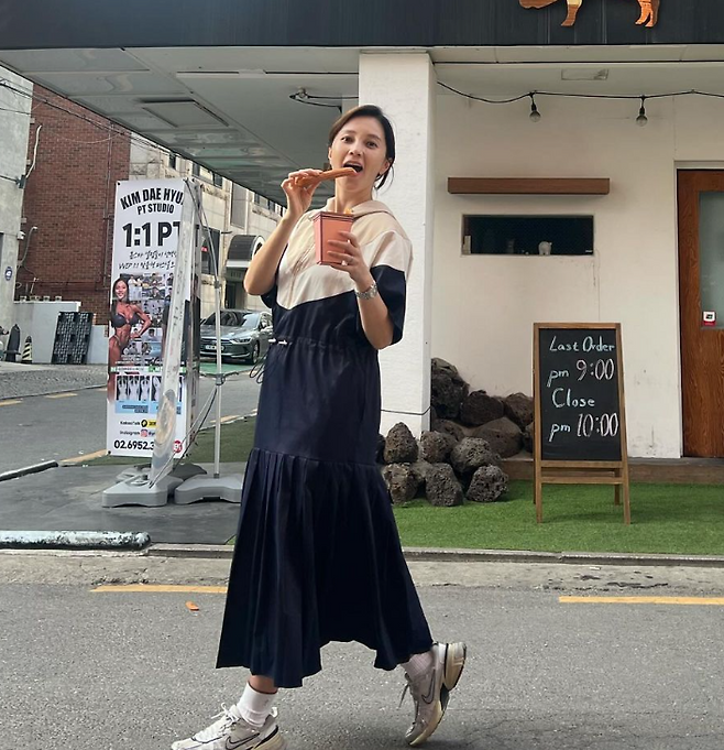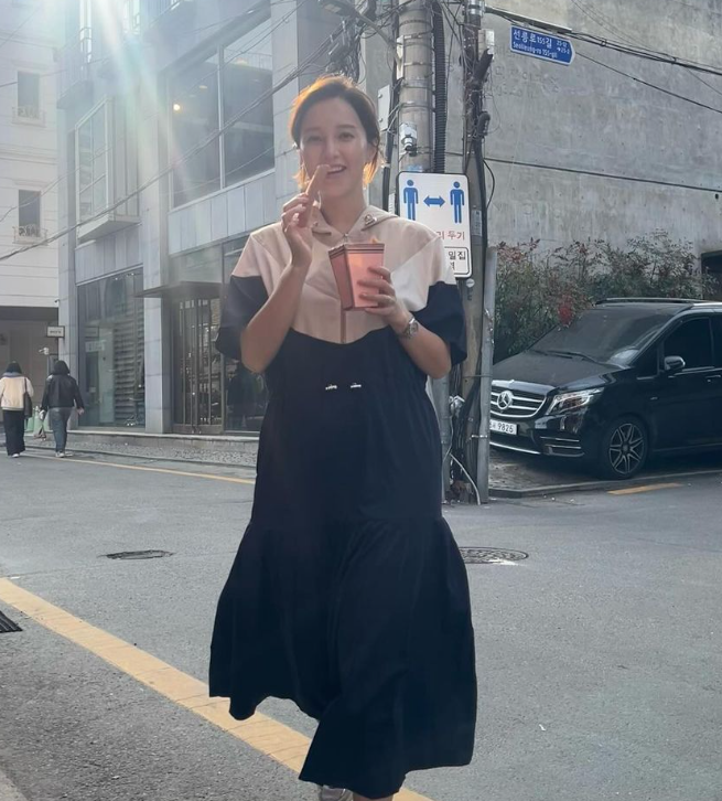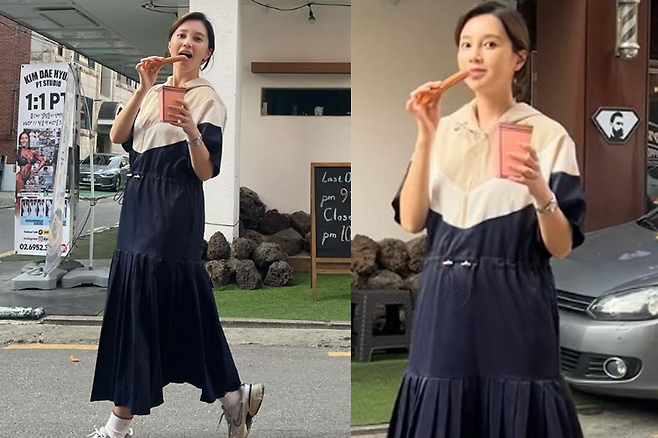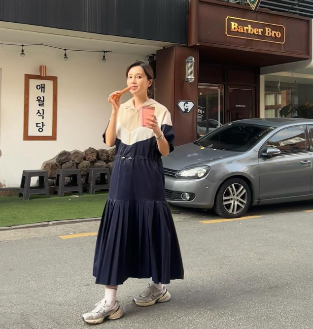 아유미는 네이비 컬러에 아이보리 컬러가 배색된 롱 원피스를 입고 나들이룩을 선보였다.