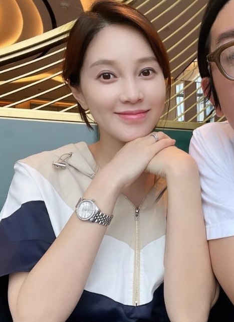 아유미는 핑크빛 메이크업으로 사랑스러운 분위기를 자아내고 실버 시계를 매치했다.