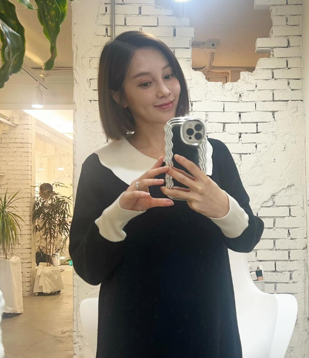 아유미는 블랙 컬러 원피스에 화이트 카라가 있는 원피스 임부복을 선보였다.