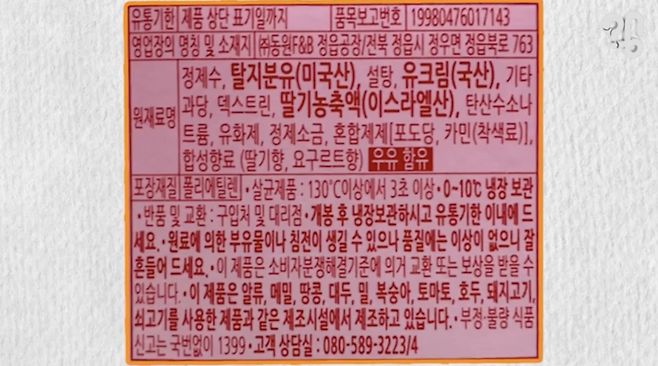 “환원유도 현재 우유로 보고 있기 때문에 우유라고 표기를 합니다. 뒤에 성분 표시에는 환원유와 원유 비율을 표시가 하도록 되어있기 때문에/이름에 말씀하신 우유나 밀크 뭐 이렇게 적는 것에 대한 별다른 제재는 따로 없습니다.”