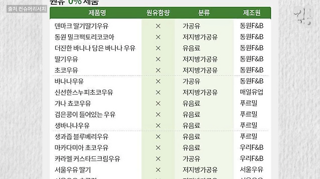 시중에 판매되는 가공우유는 무려 60개나 된다. 이 중에서 원유가 한 방울도 포함되지 않은, 원유 0퍼센트의 우유는 15개였다. 원유 함량이 50퍼센트 미만인 제품은 53개. 원유 함량 75퍼센트 이상인 우유는 단 6개에 불과했다. 가장 원유 함량이 높은 가공 우유는 원유 함량 85.7퍼센트의 빙그레 바나나맛 우유인데 대신 가격은 비싸다. 그럼 원유 0퍼센트의 우유들은 원유 대신 어떤 걸 쓰는 걸까?