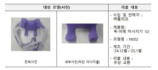 산업통상자원부 국가기술표준원은 ㈜풀리오가 판매한 목·어깨 마사지기 V2 일부 제품에 대해 자발적 리콜(제품 무상 교환)을 실시한다고 26일 밝혔다.