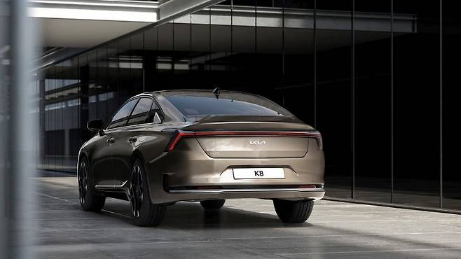 후면부 역시 전면부 디자인과의 완벽한 균형을 이루며 K8의 전체적인 완성도를 높입니다. 전면부와 통일감을 이루는 스타맵 시그니처 라이팅 테일램프는 좌우로 길게 연결되어 차량의 안정감을 강조하며, 넓고 낮은 차폭을 시각적으로 구현합니다. 입체적으로 디자인된 테일게이트는 후면부에 볼륨감과 고급스러움을 더하며, 마치 조각 작품을 보는 듯한 착각을 불러일으킵니다. 낮고 넓게 깔린 듯한 후면부 실루엣은 K8의 스포티하면서도 우아한 매력을 극대화하며, 후방에서도 K8만의 독특한 존재감을 확실히 각인시킵니다. 이러한 전후면부의 완벽한 조화는 K8이 가진 디자인의 힘을 여실히 보여줍니다.