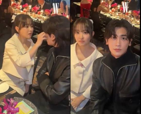 두 사람은 살짝 얼었다가 자연스럽게 손인사를 하며 와인잔도 부딪치는 여유를 보여주기도 했다. 박보영은 박형식과 나란히 옆자리에 앉았고, 영화 ‘너의 결혼식’에서 호흡을 맞췄던 배우 김영광과 인사를 나눴다.