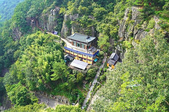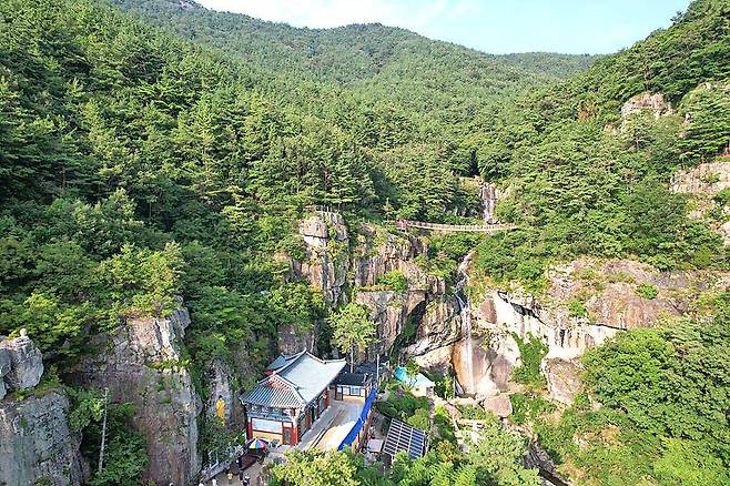 안개가 자욱하게 낀 구절산 자락, 굉음을 내며 쏟아지는 폭포수, 그리고 그 옆에 자리한 작은 암자의 조화는 한 폭의 진경산수화를 보는 듯합니다. 폭포 아래에서 올려다보는 풍경도 멋지지만, 암자 마당에서 폭포와 눈높이를 맞추고 바라보는 뷰는 인생 사진을 남기기에 부족함이 없습니다.