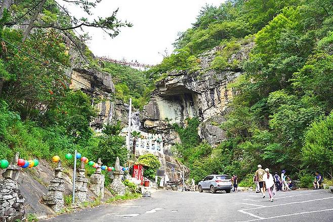 호랑이 조형물 옆에서 절벽 아래를 내려다보면, 왜 옛사람들이 이곳을 신성시했는지 단번에 이해할 수 있을 만큼 압도적인 풍경이 펼쳐집니다.