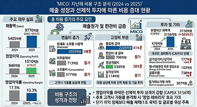 또 다른 요인은 공격적인 설비투자(CAPEX)다. 미코의 연결기준 유형자산 취득액은 2023년 476억원에서 지난해 3156억원으로 563% 증가했다. 이에 따라 감가상각비와 상각비도 777억원으로 전년 대비 64.3% 늘었다. 대규모 설비 투자로 단기적으로는 회계상 이익이 눌리는 구간에 진입한 것으로 해석된다.