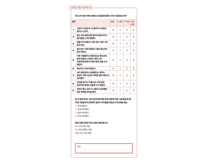 센터에서 시행하는 PHQ-9 검사를 스스로 해보는 것만으로도 도움이 됩니다. 일상에서 흥미가 저하된다든지, 지속적으로 우울감을 느낀다든지, 집중력이 떨어지고 수면이나 식욕·체중에 변화가 생긴다든지를 체크해보는 것입니다. 센터 누리집을 통해서도 검사문항들을 확인하고 결과를 바로 볼 수 있습니다.