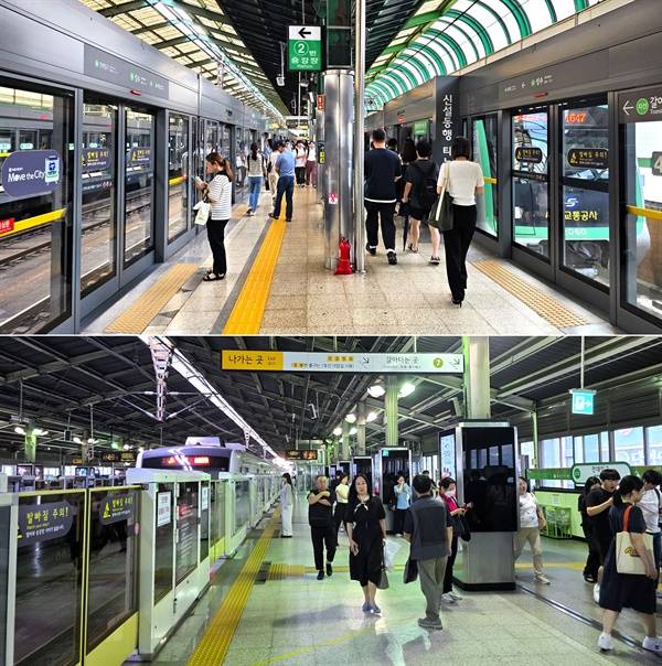 | ▲ 성수역 승강장(윗쪽)과 건대입구역 2호선 승강장. 성수역의 승강장 폭은 4.5m 남짓으로 다른 전철역에 비해 두 배가 약간 못 되게 좁다. 이런 상황에서 합리적인 인파 관리 방안이 없으면 혼잡은 승강장으로 이어질 수 있다는 우려가 나온다. |