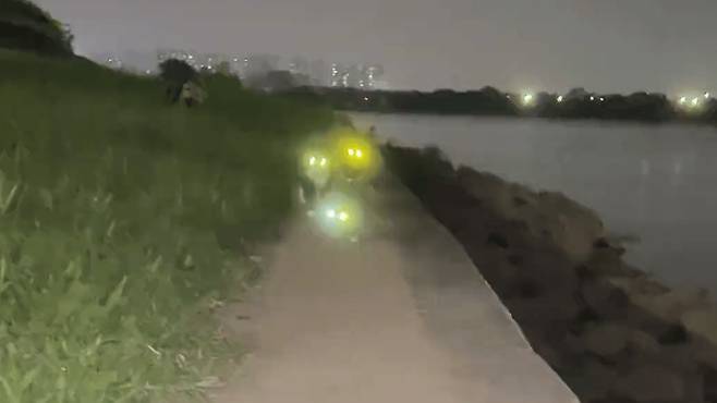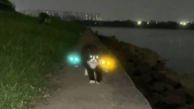 이 강변 산책은 이 세 마리의 '손전등' 고양이들 때문에 무척 재미있어졌습니다.