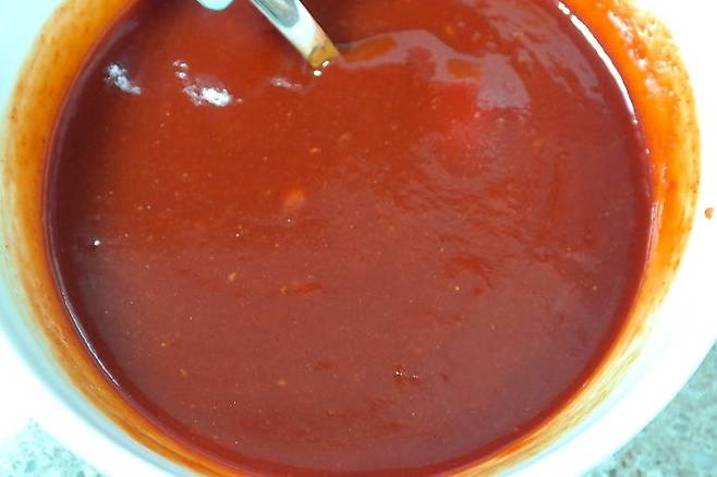 1. 토마토케첩과 고추장 소스를 넣고 잘 섞어줍니다.