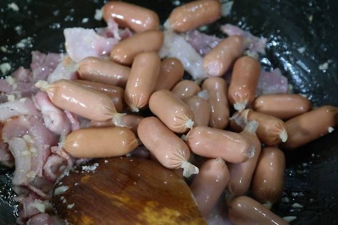 2. 베이컨이 어느 정도 익으면 소시지를 넣고 함께 볶습니다.