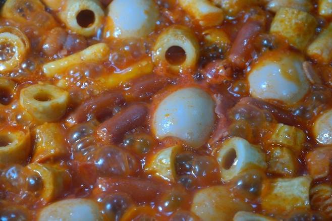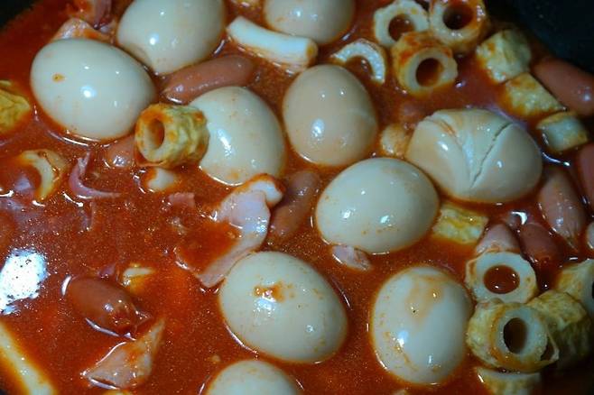 3. 삶은 계란을 넣고 함께 끓여줍니다. 계란은 떡볶이 국물과 함께 먹으면 더욱 맛있습니다.