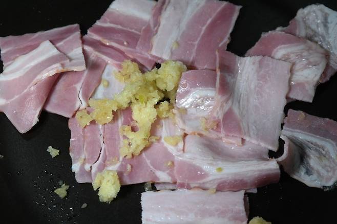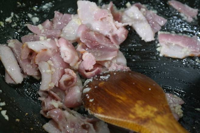 1. 베이컨에 다진 마늘을 넣고 먼저 볶아줍니다. 베이컨의 풍미가 떡볶이에 깊은 맛을 더해줍니다.