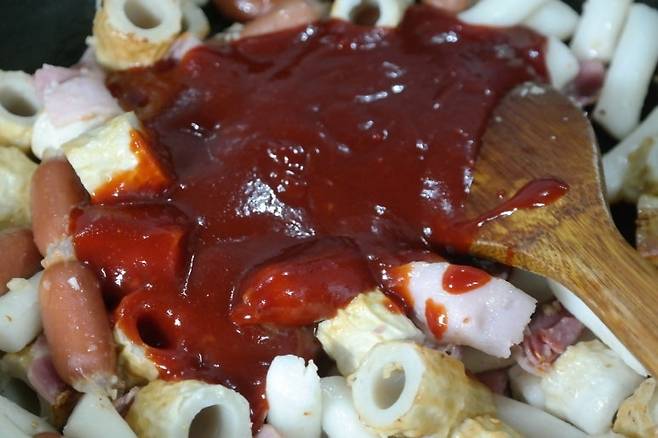 떡볶이 맛을 좌우하는 양념장! 토마토케첩과 고추장을 섞어 단맛과 매콤함을 조절합니다. 매운맛을 싫어하는 분들은 고추장 양을 줄이고, 단맛을 더하고 싶다면 조청이나 물엿을 추가하세요.