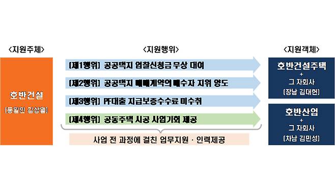 공정위에 따르면 호반건설은 호반건설주택 등 19곳에 공공택지 입찰신청금 총 1조5753억원을 414회에 걸쳐 무상으로 빌려줬다. 또 2013~2015년에는 당첨 확률을 높이기 위해 여러 개의 계열사를 설립하고 공공택지 입찰에 참여하는 이른바 '벌떼 입찰'로 공공택지를 낙찰 받았다. 낙찰 받은 23곳의 공공택지는 2세 회사 등 9곳에 양도했다. 이에 따라 2세 관련 회사들은 공공택지 시행사업에서 분양매출 5조8575억원, 분양이익 1조3587억원을 올릴 수 있었다고 공정위는 설명했다.