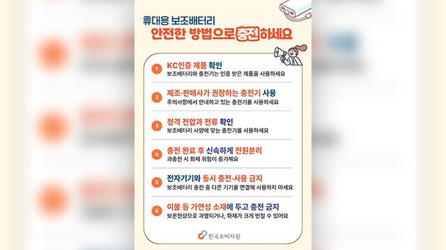 소비자원은 보조배터리를 충전할 때, 제품 설명서 등에 안내된 정격 충전기를 사용하고, 충전이 끝나면 전원을 분리할 것, 이불 등 불에 탈 수 있는 소재 가까이에서 충전하지 말 것 등을 당부했습니다.