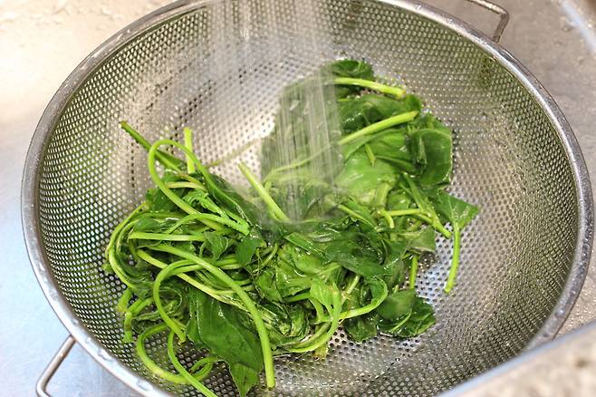채반으로 건져서 재빠르게 찬물에서 여러번 헹궈줍니다. 이물질은 없는지 꼼꼼하게 세척해요.
