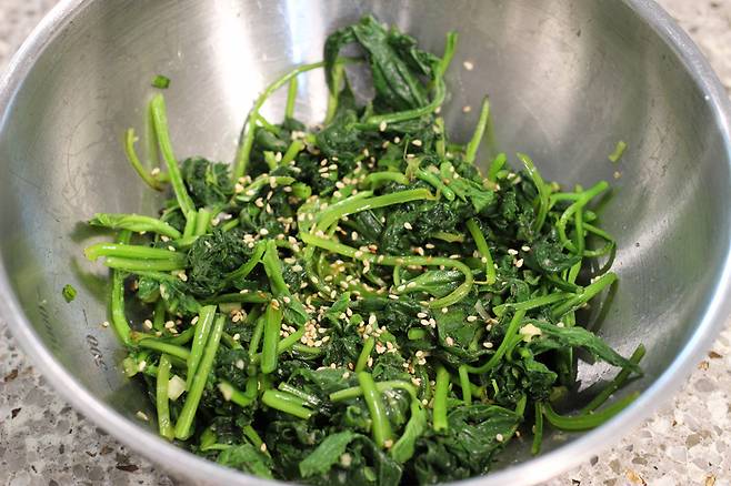 들기름과 통깨를 넣어 마무리하면 완성입니다.