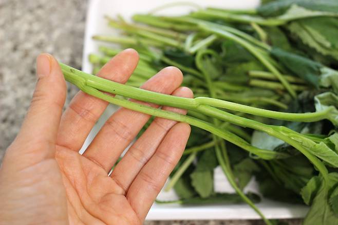 두꺼운 줄기는 질겨서 먹기 힘들어요. 두꺼운 줄기는 잘라내고 얇은 줄기를 톡톡 떼어내 다듬어줍니다.